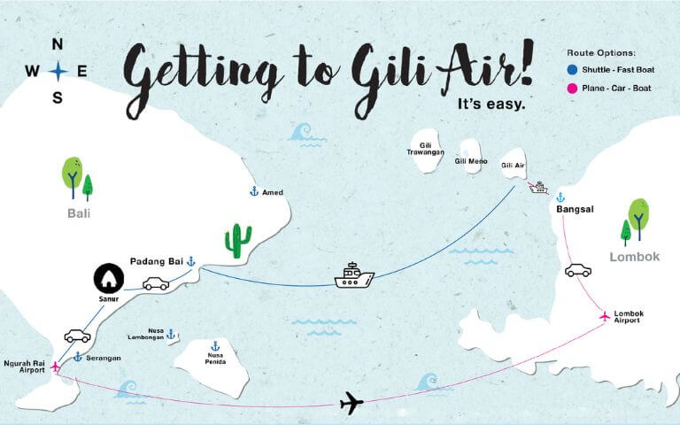 Via Bali Fly into Bali, then take a 3-hour fast boat from Serangan Harbour. We recommend Blue Water Express, which offers hotel pickup and drop-off at Gili Air. Cost: IDR 900,000 Includes hotel pickup in Bali, we recommend staying in Sanur, as it’s conveniently located near the boat departure point.